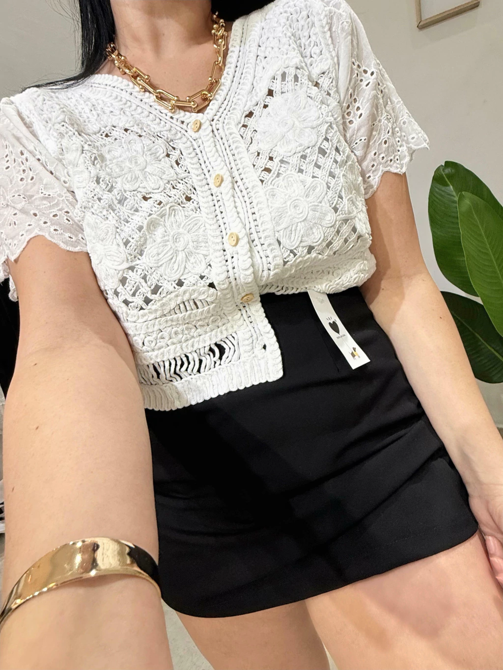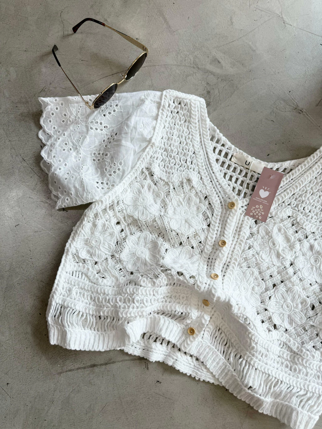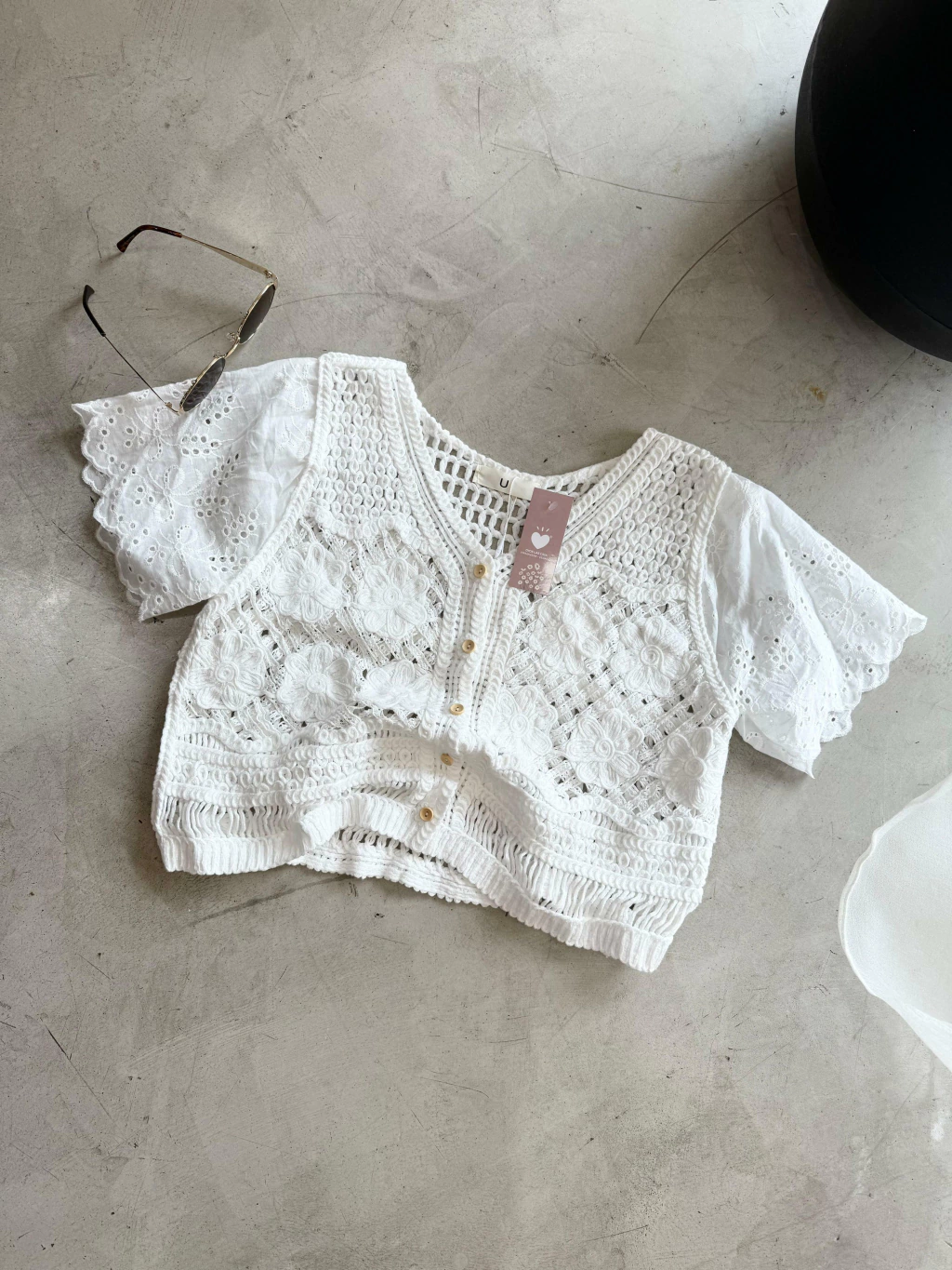 Blusa tejida en estapalda y frente con mangas de broderie.
