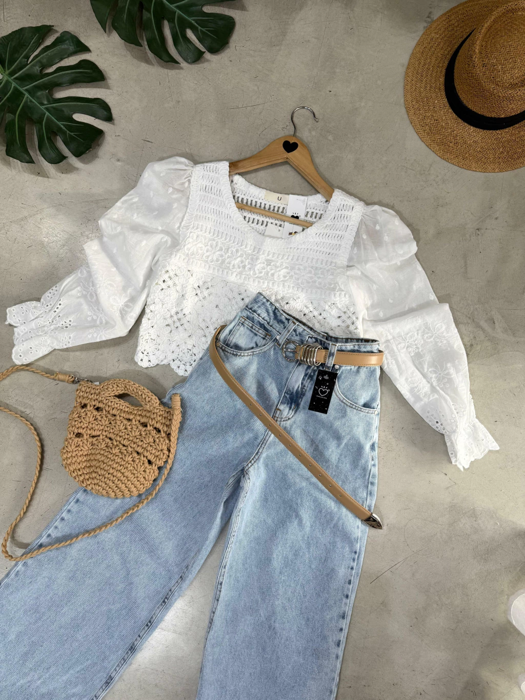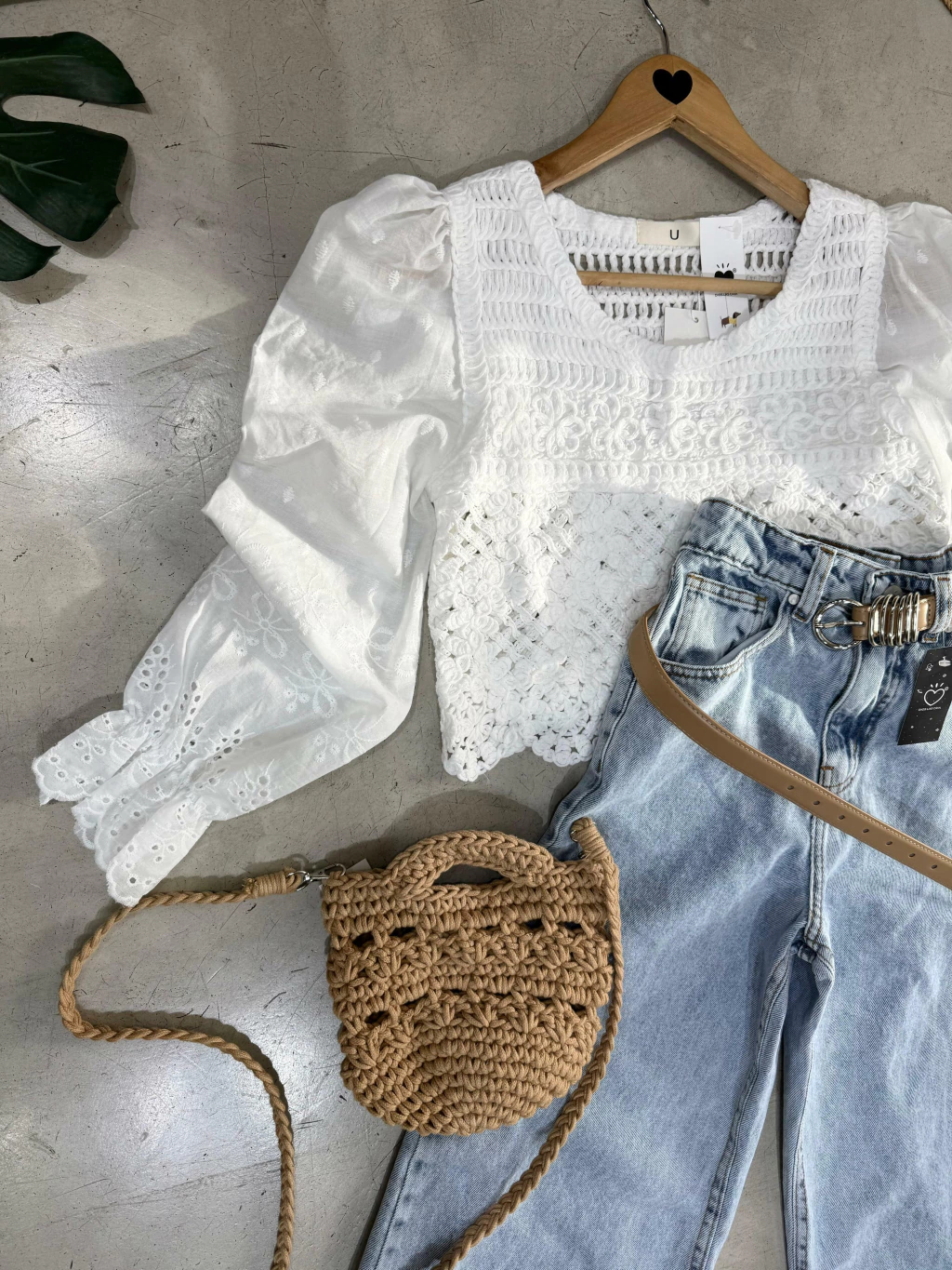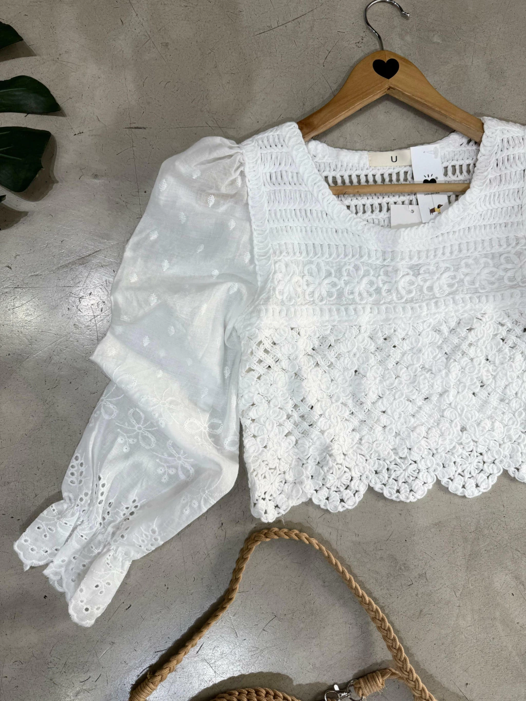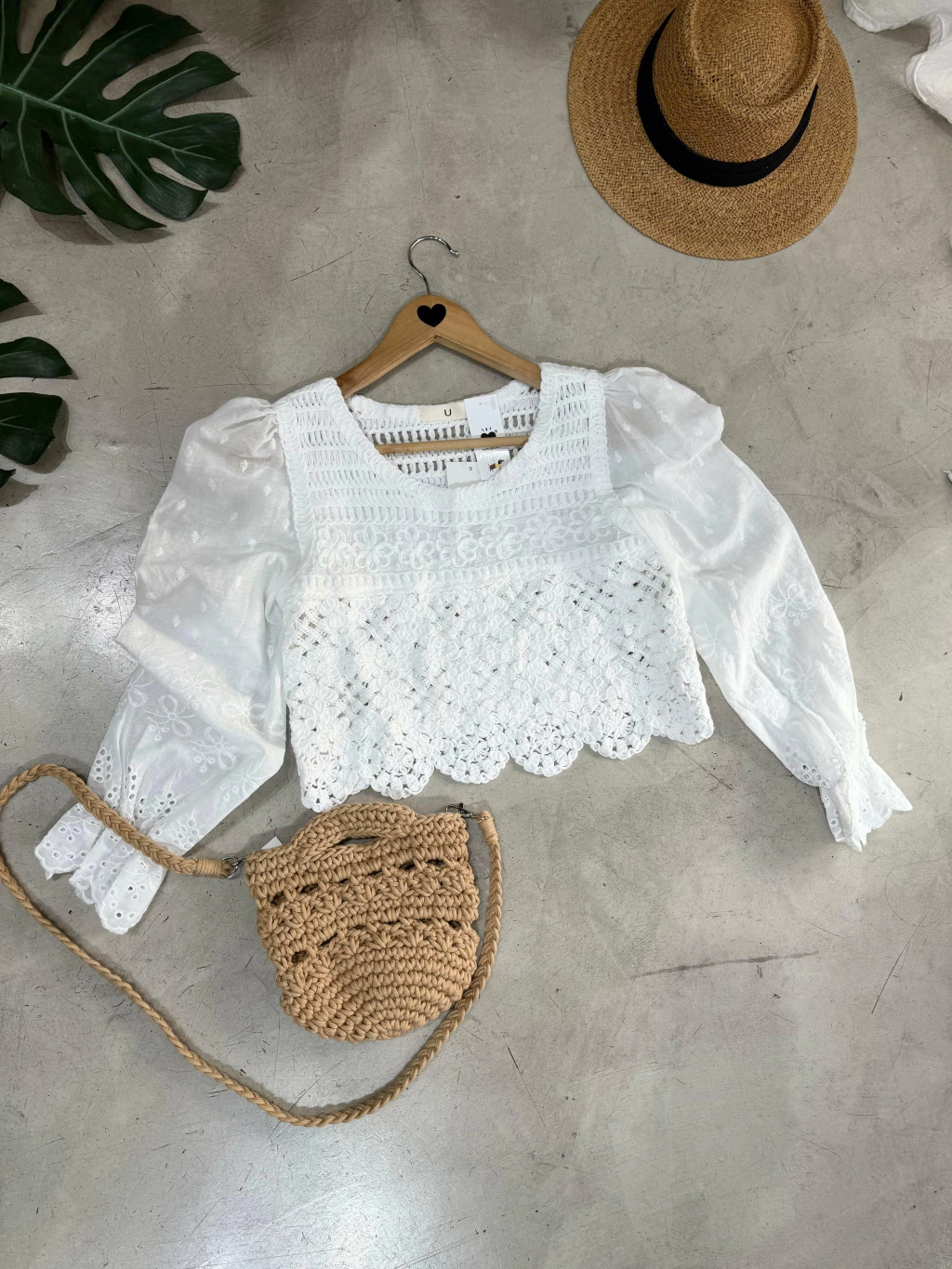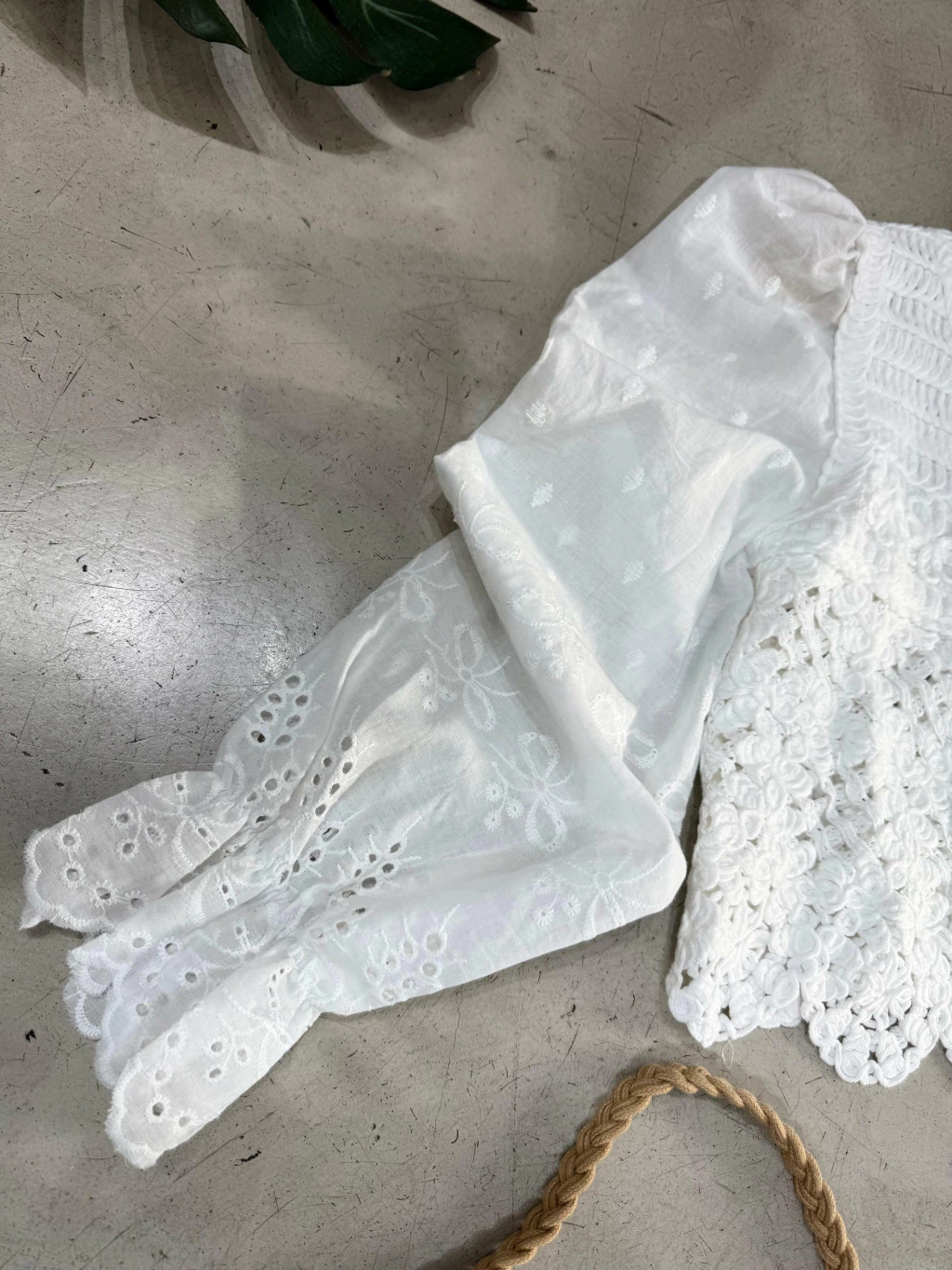 Blusa confeccionada en macrame. Mangas de broderie con puños calados. Importada
