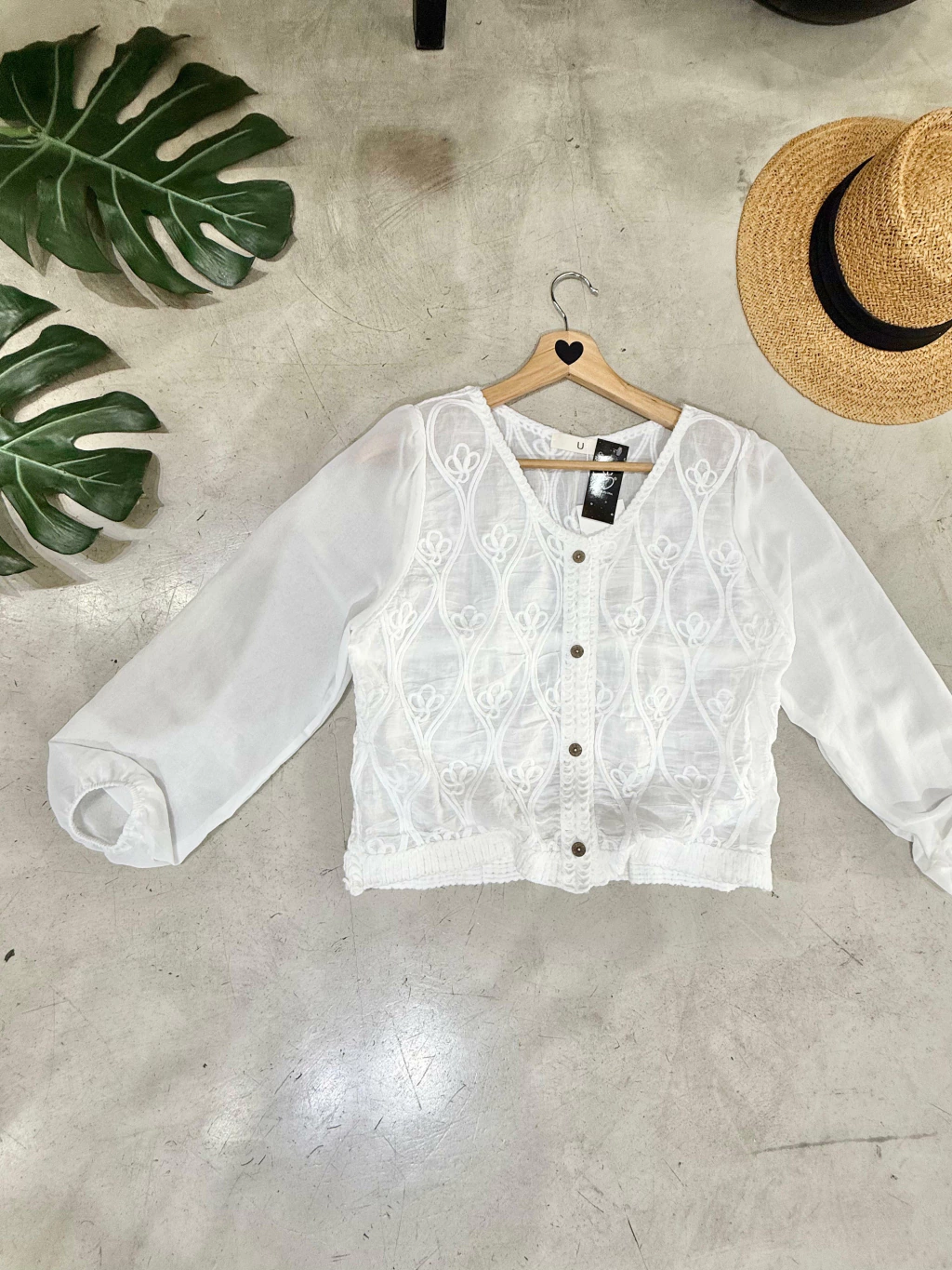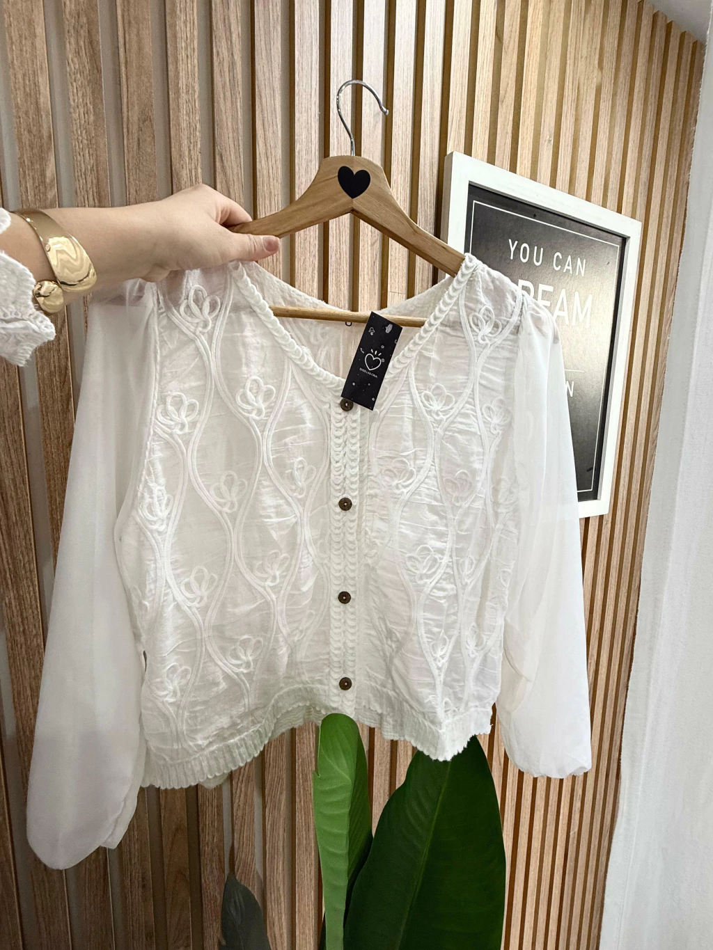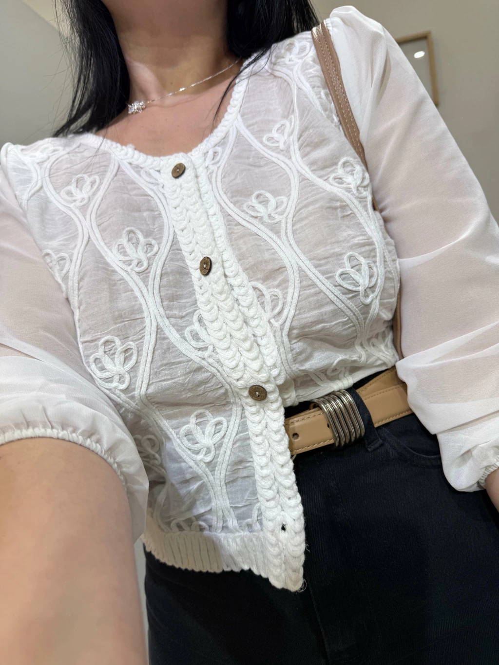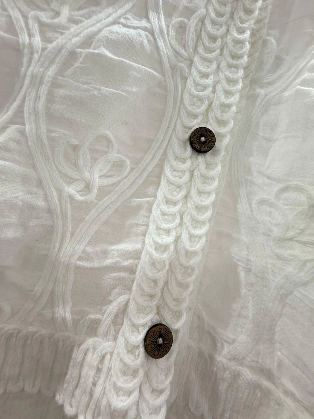 Blusa blanca de manga larga confeccionada en gasa bordada y translúcida, con frente y espalda de macrame bordado en relieve con motivos florales. Los botones son de madera, pequeños y con diseño grabado. Mangas amplias, con puño elastizado