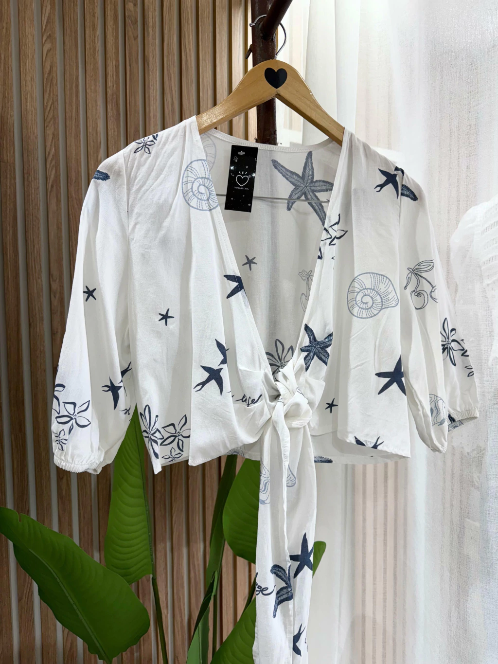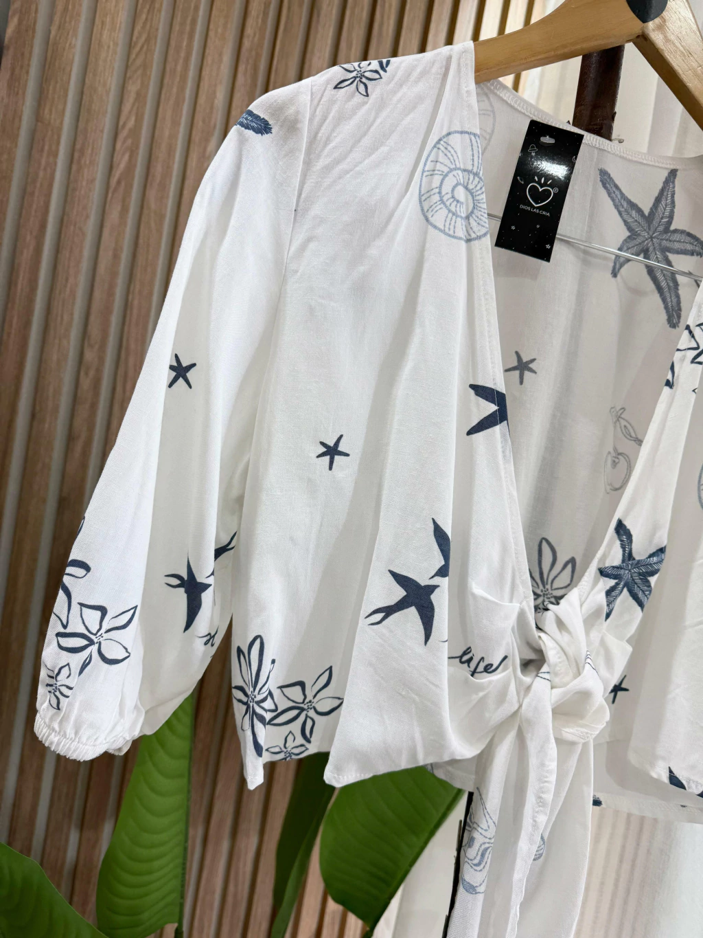 Blusa fresca y liviana de manga 3/4 estapada. Escote en “V” y lazo frontal para anudar para regular