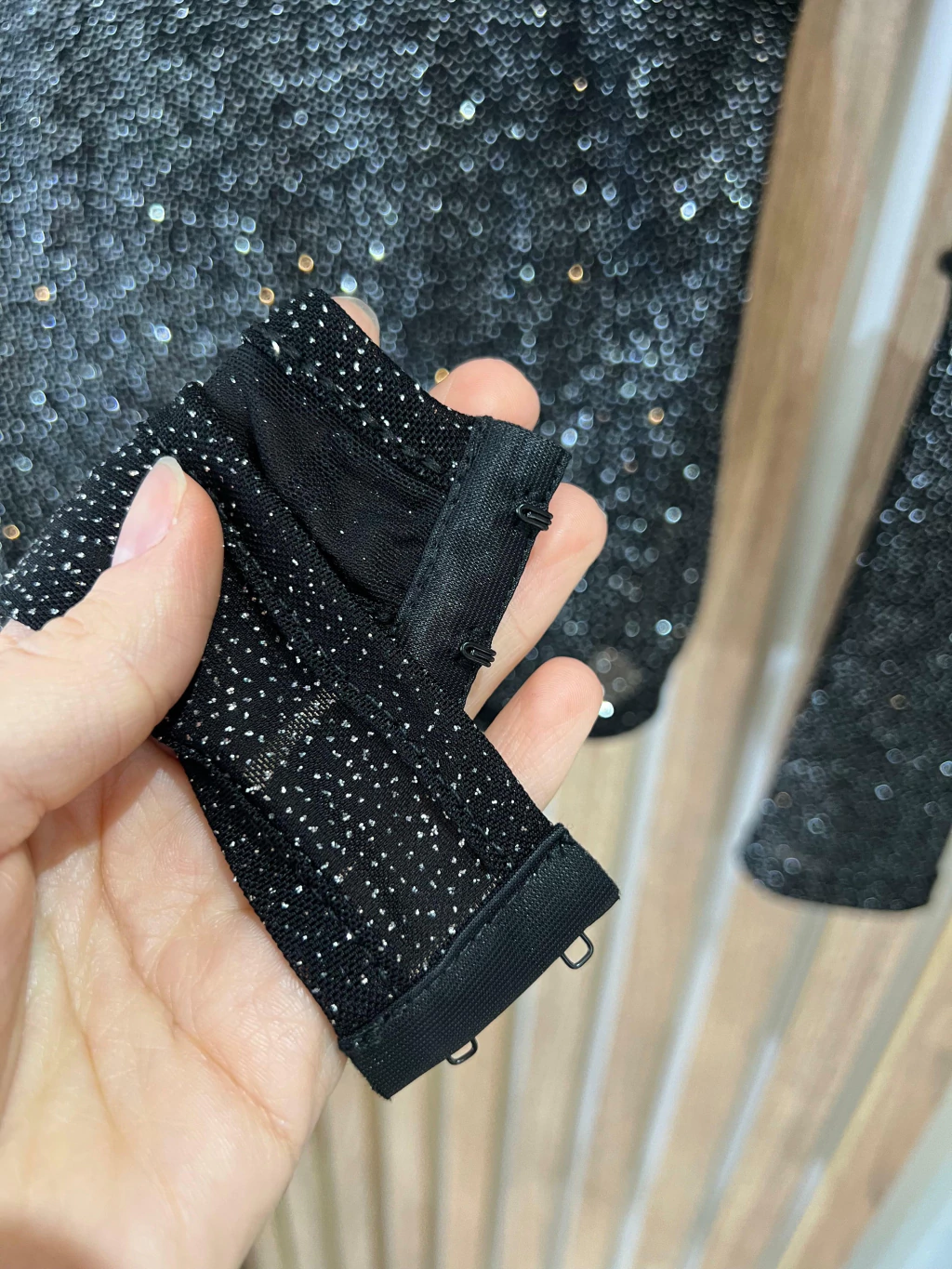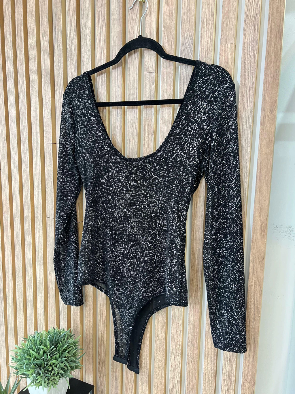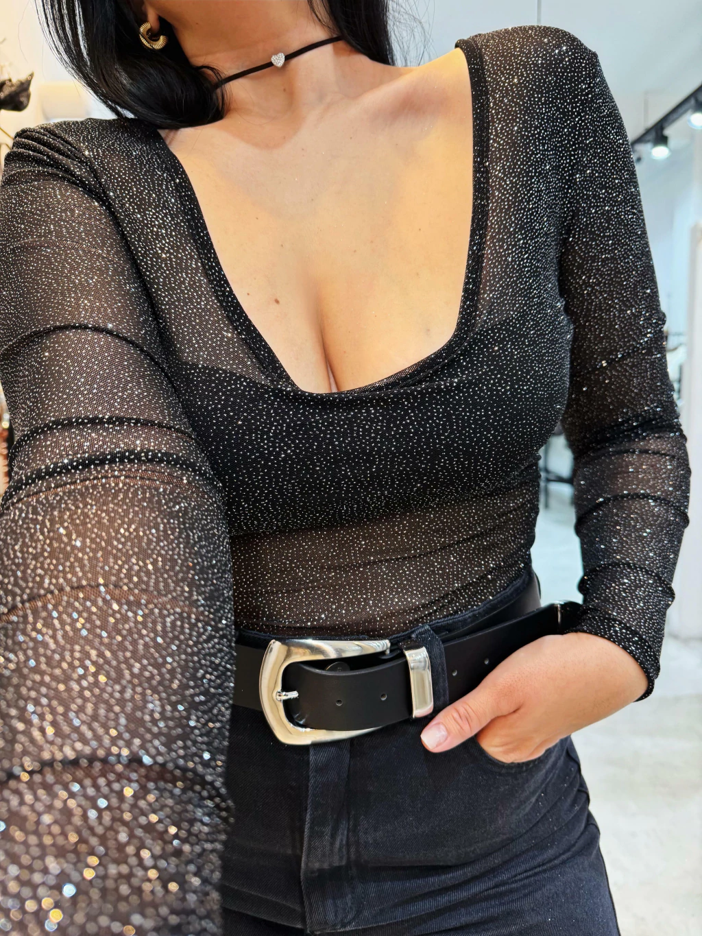 Body confeccionado en tul elástico negro con acabado glitter. Escote profundo con forro strapless interno en la parte delantera. Buen espandex.