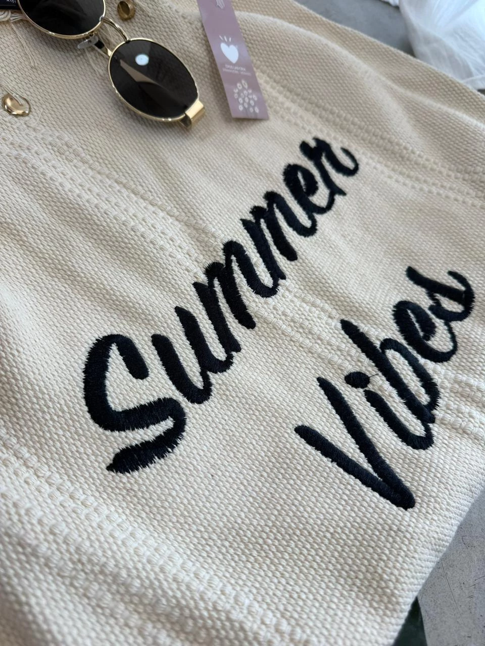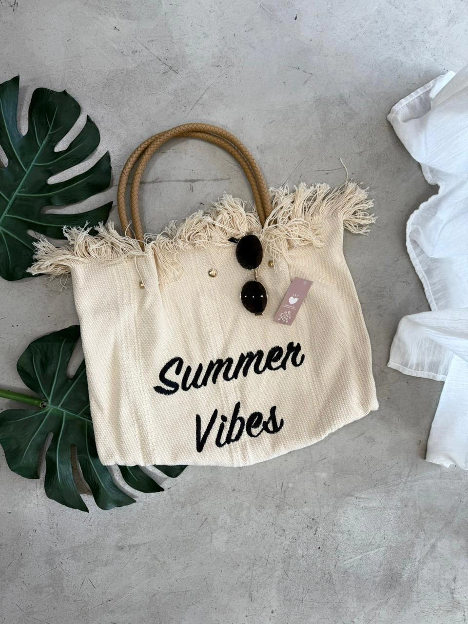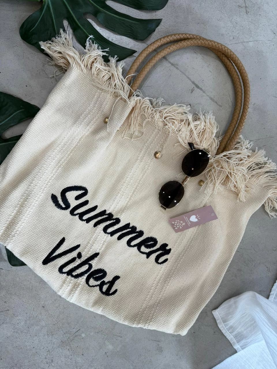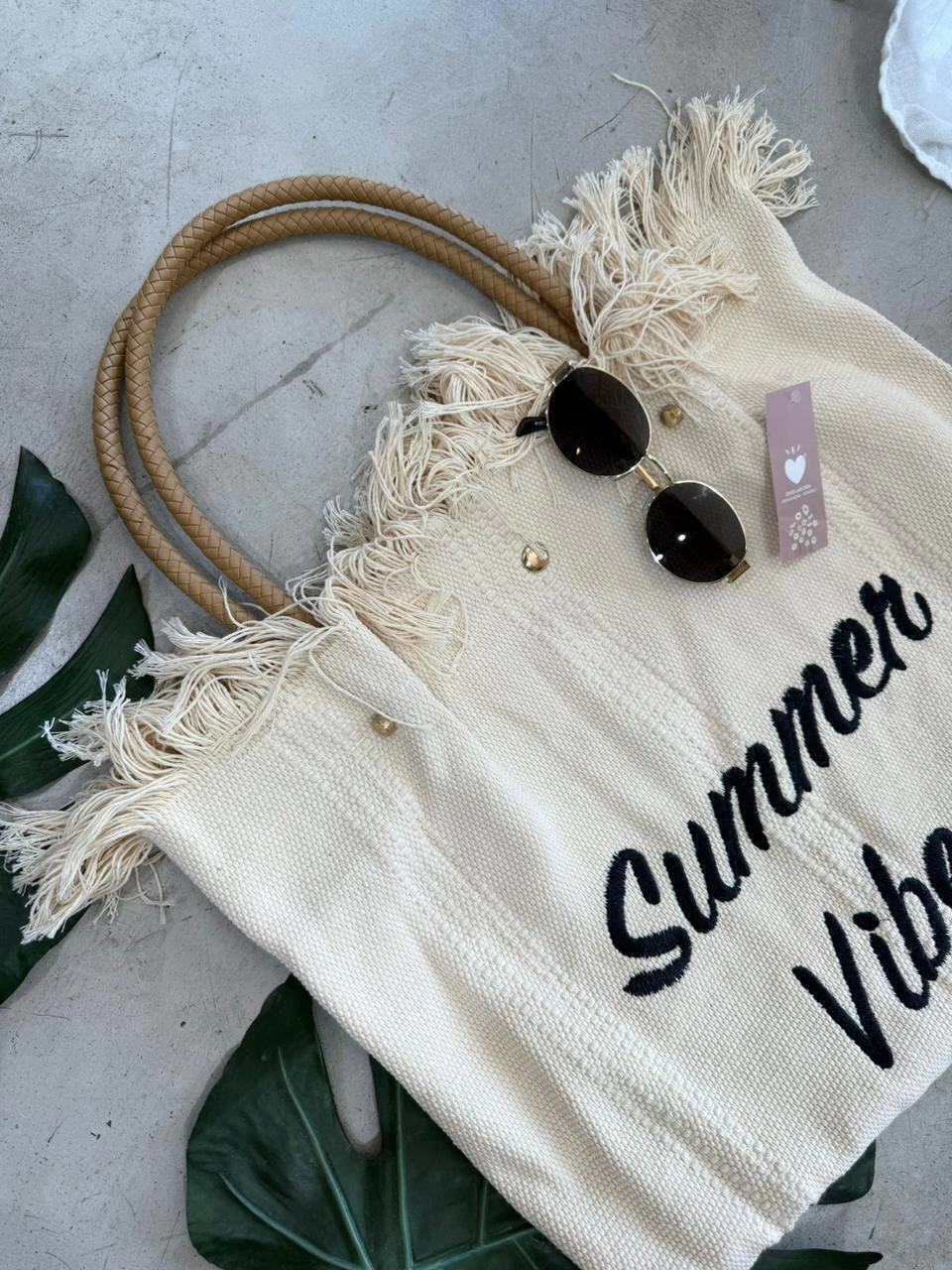 Bolso de hilo tejido, tipo playero , con flecos, bordado, tiras de eco cuero trenzado