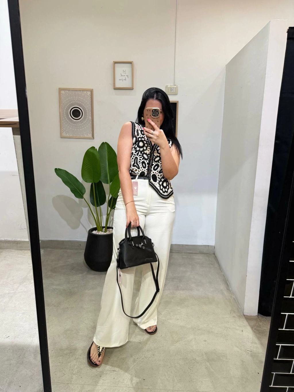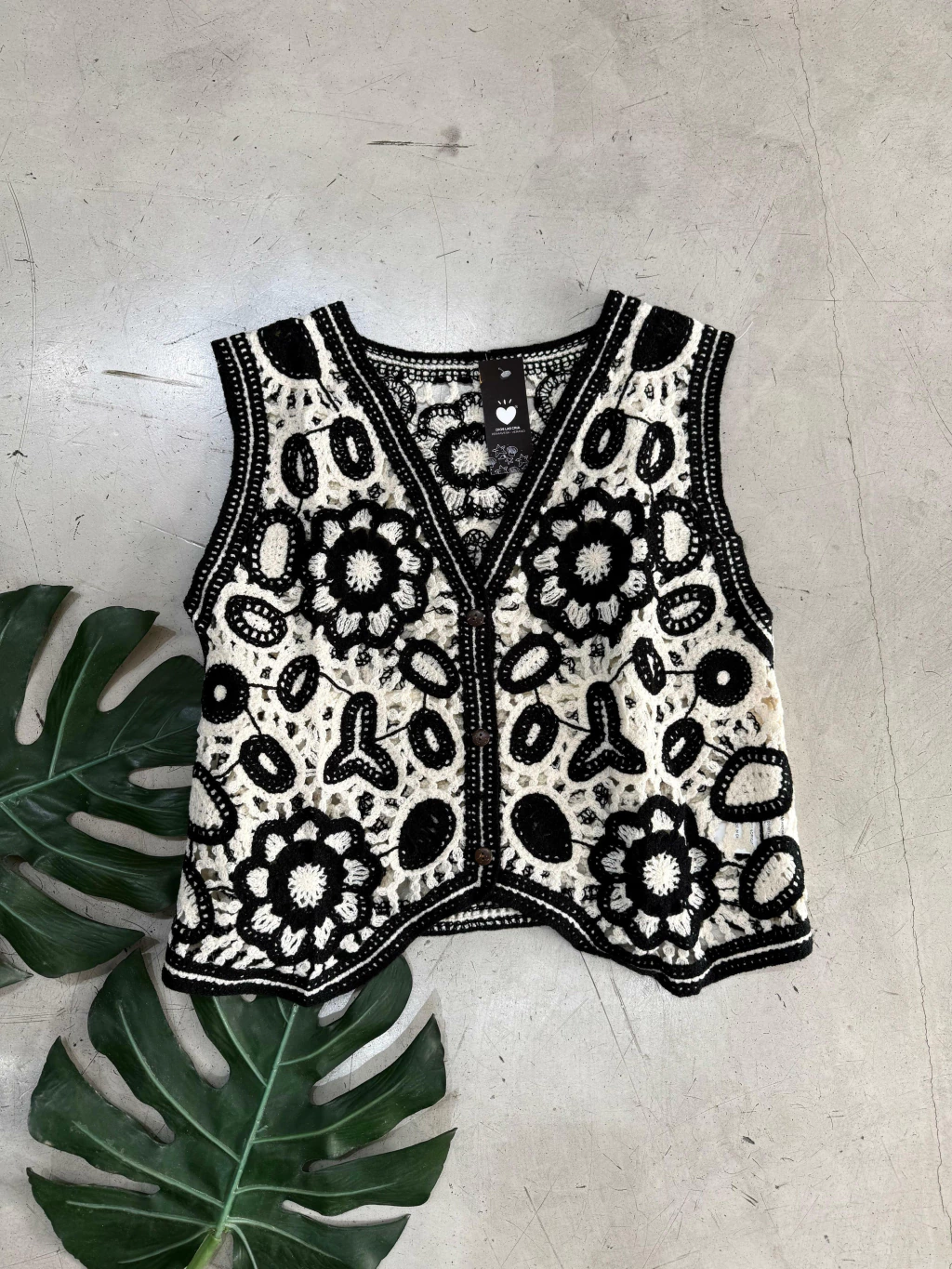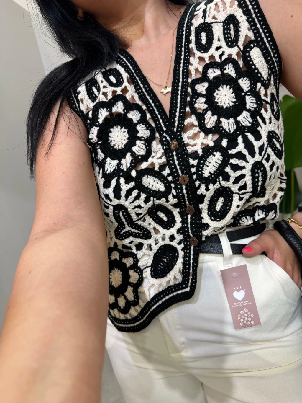 Chaleco tejido en hilo tipo crochet. Botoncitos de madera