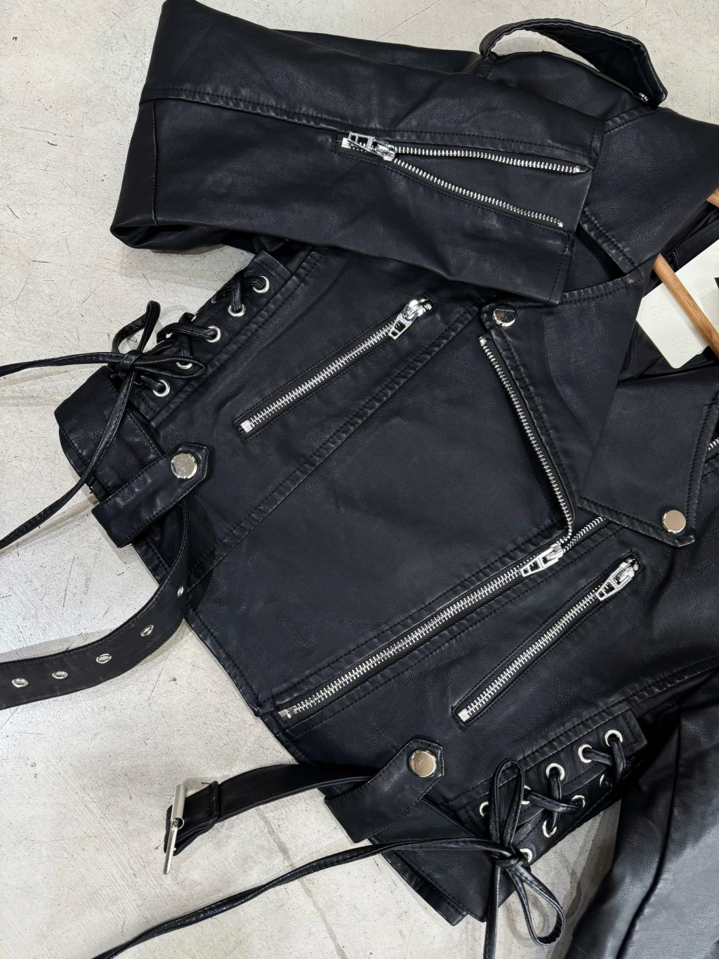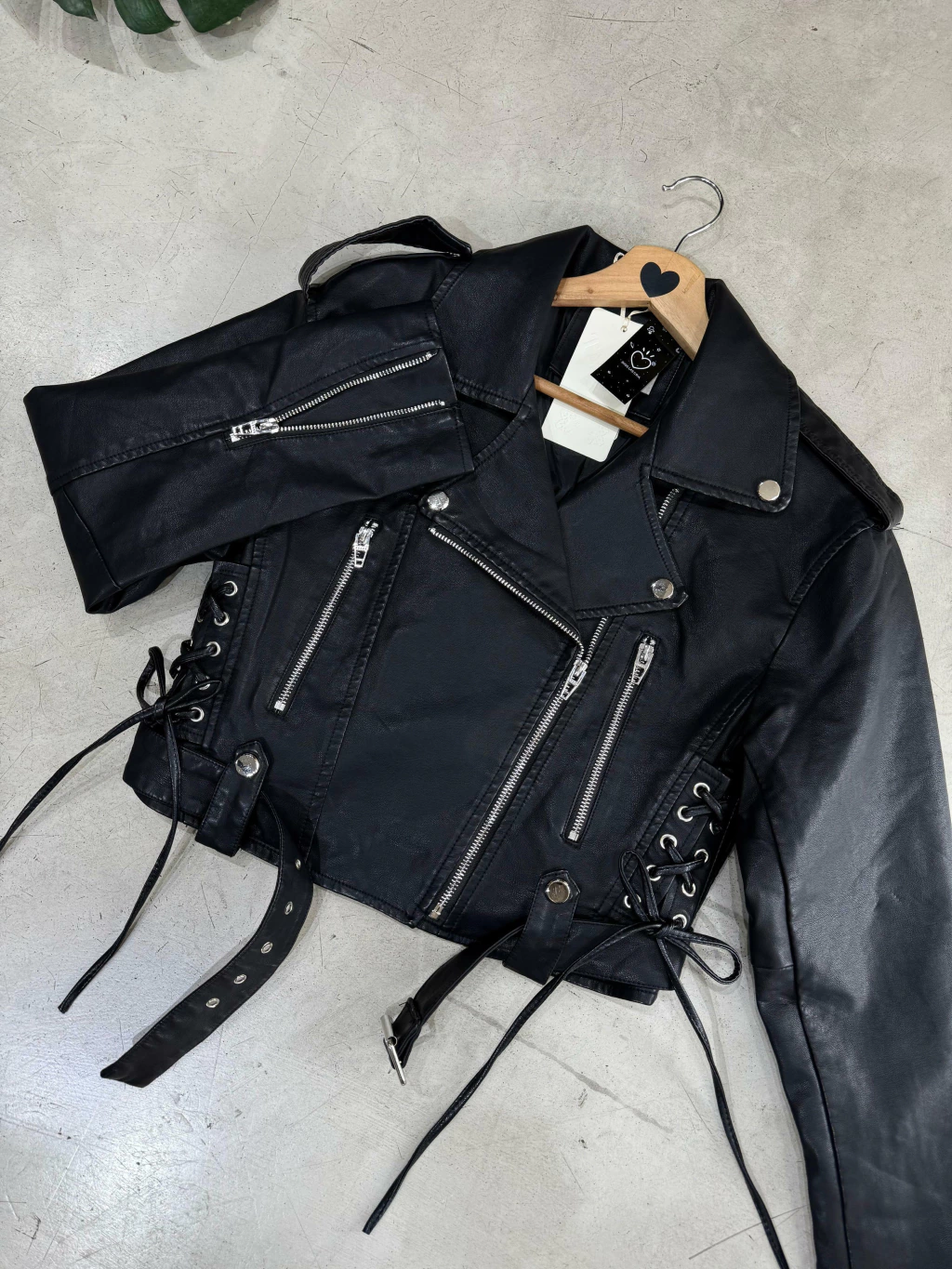 Chaqueta confeccionada en eco cuero. Laterales con tiras de ajuste con ojales y cordones que regulan el calce. Cierre metálico en la parte inferior de las mangas. Cinturón con hebilla metálica en la parte inferior.