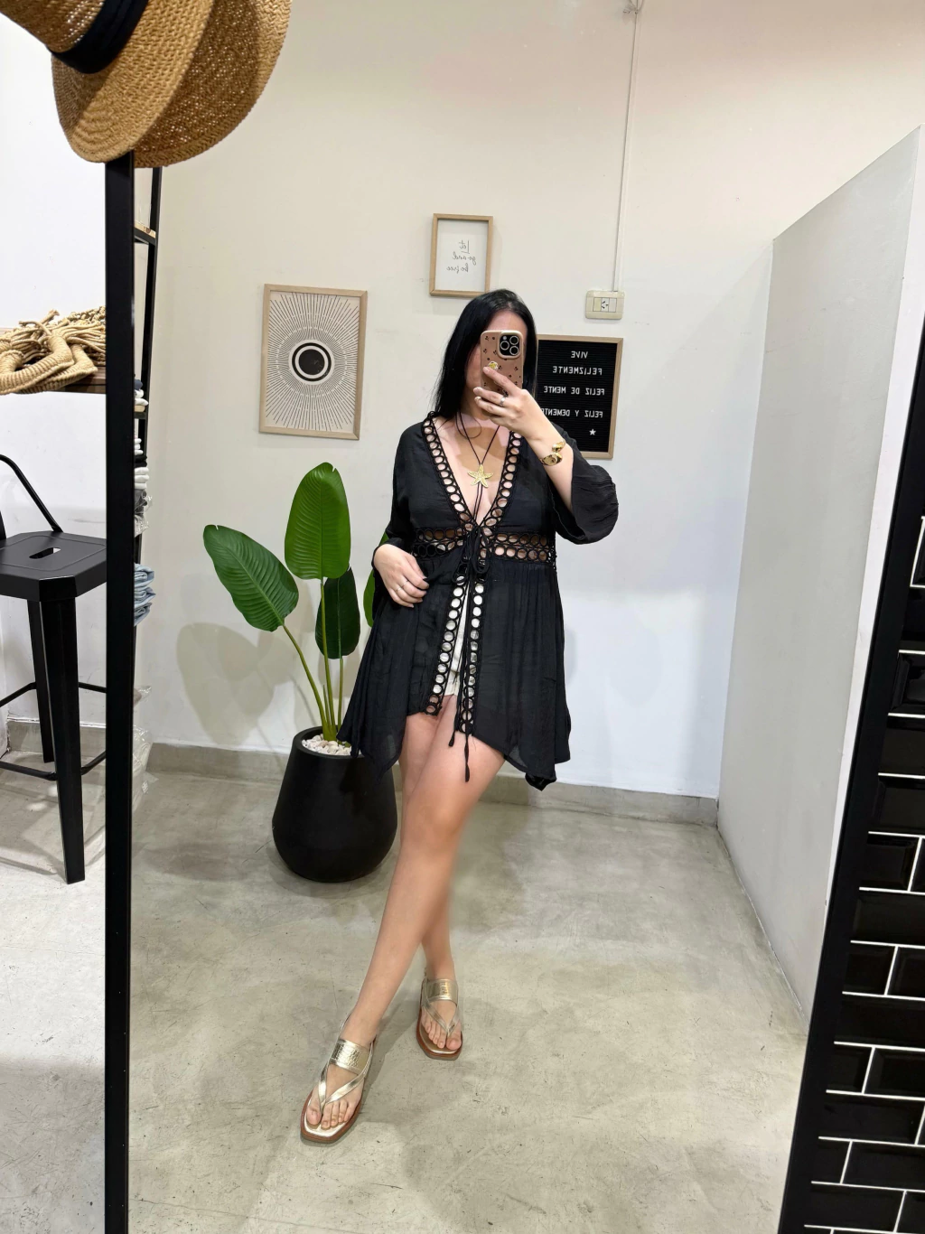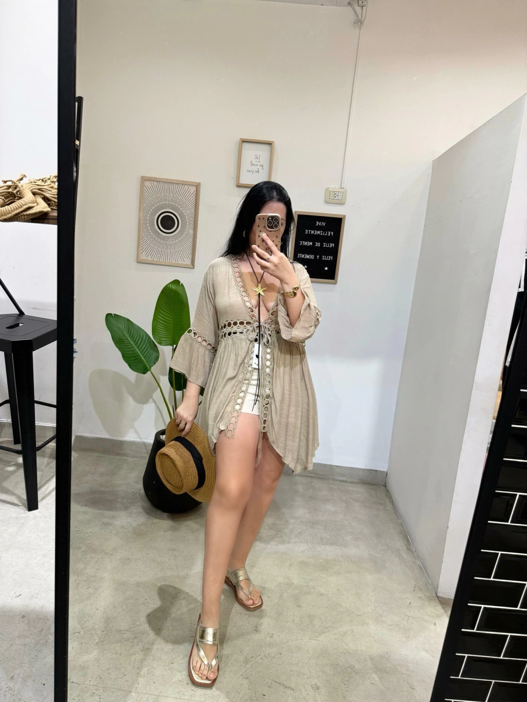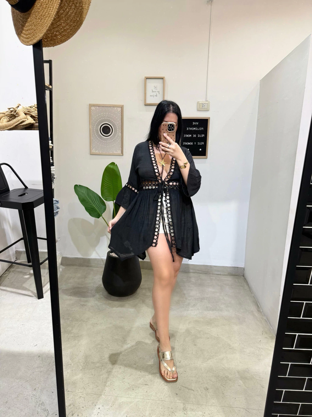 Kimono confeccionado en bambula para usarlo desatado o atado tipo vestido.