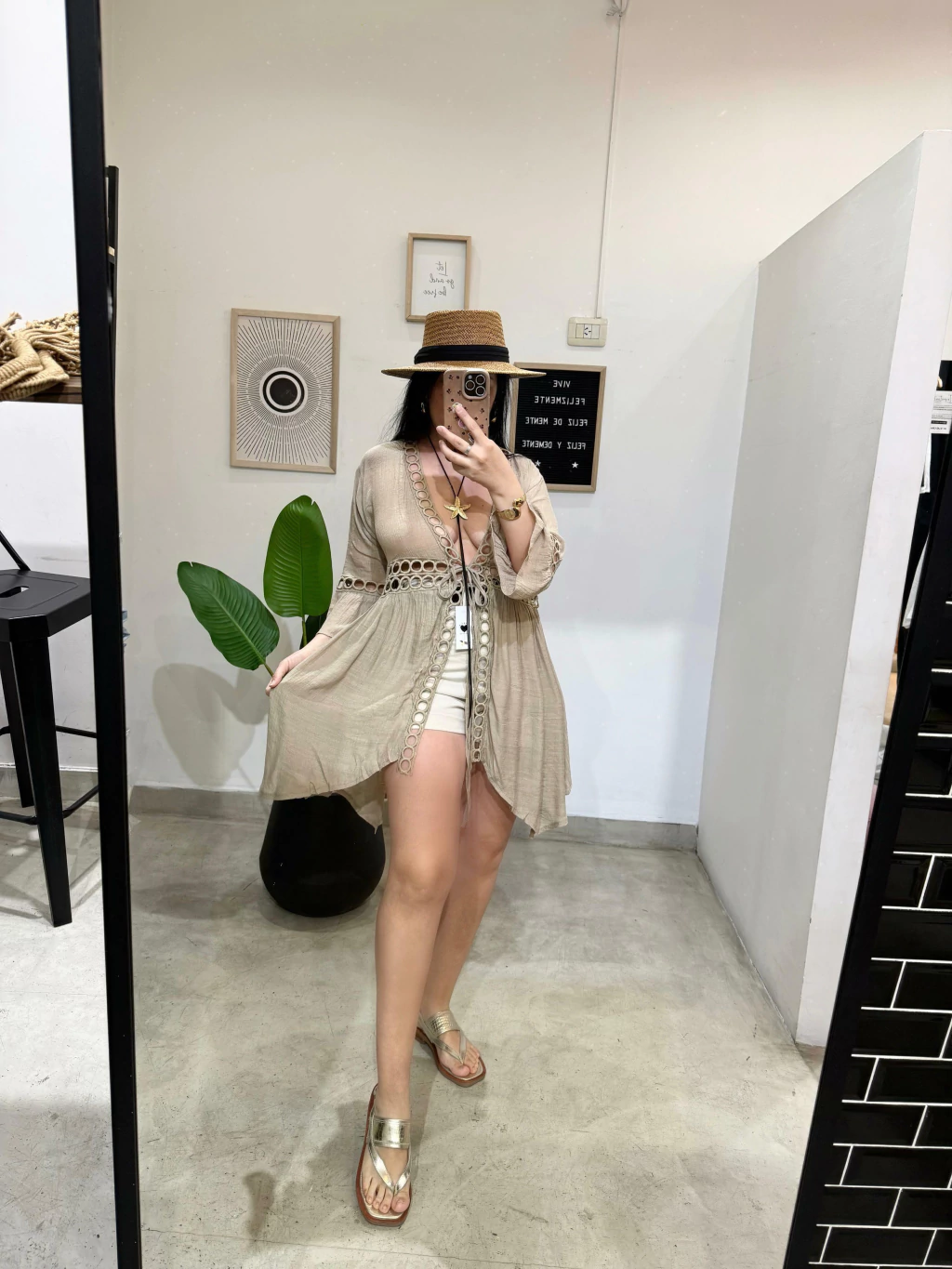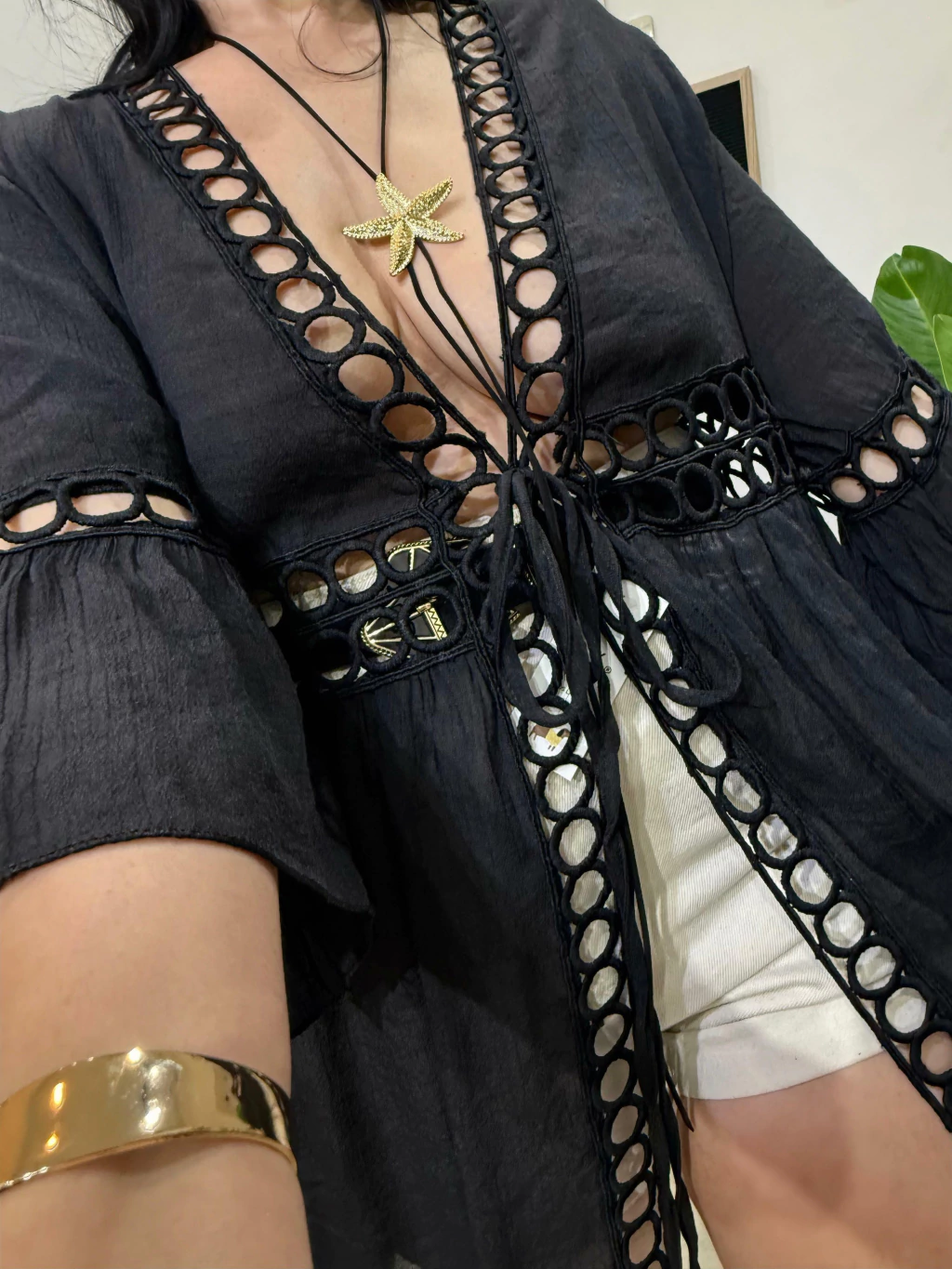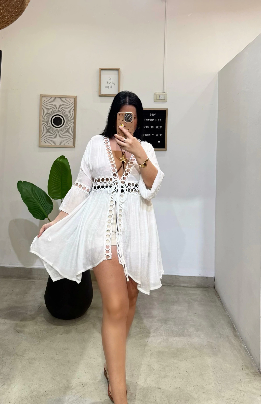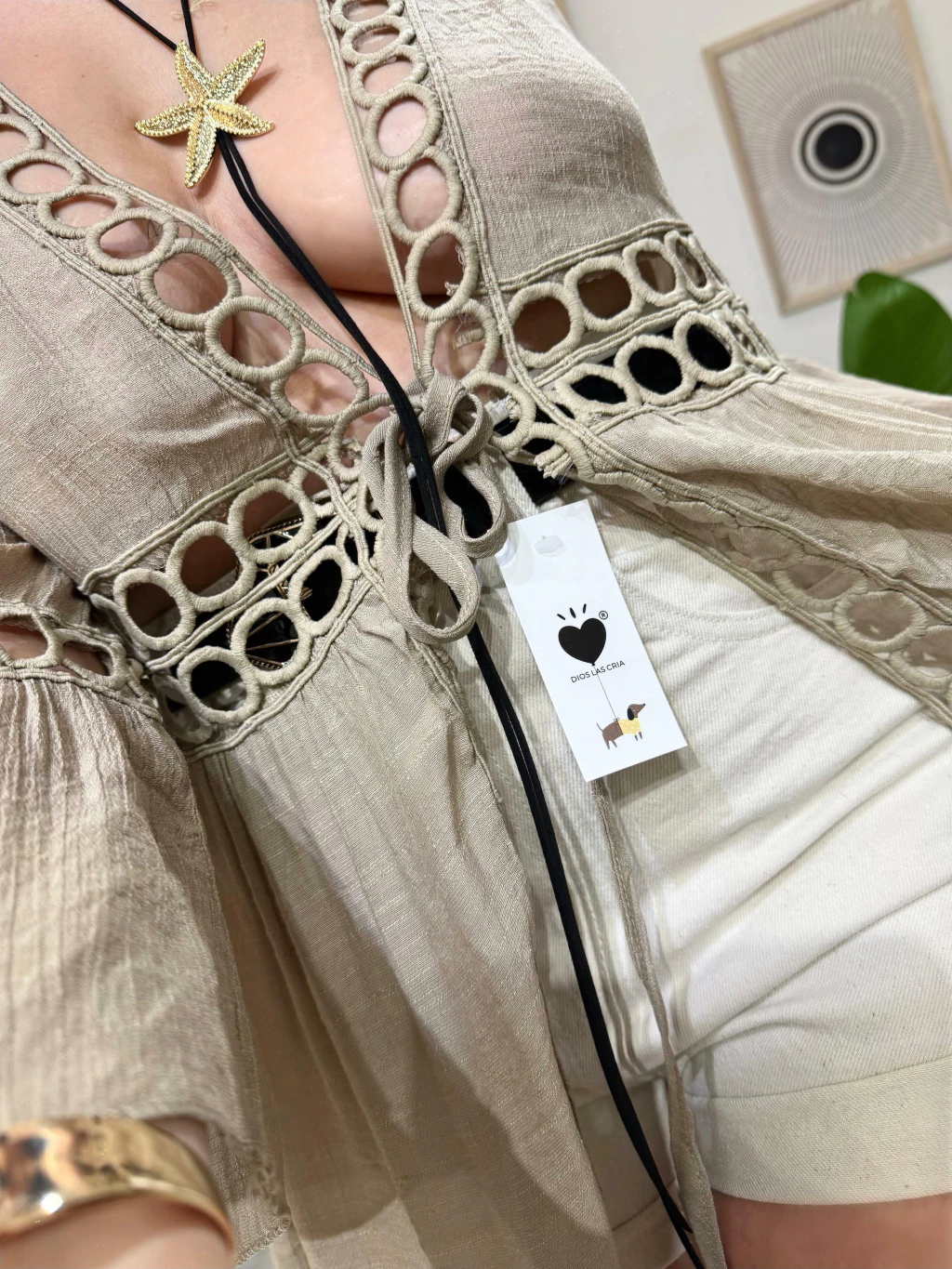 Kimono confeccionado en bambula para usarlo desatado o atado tipo vestido.