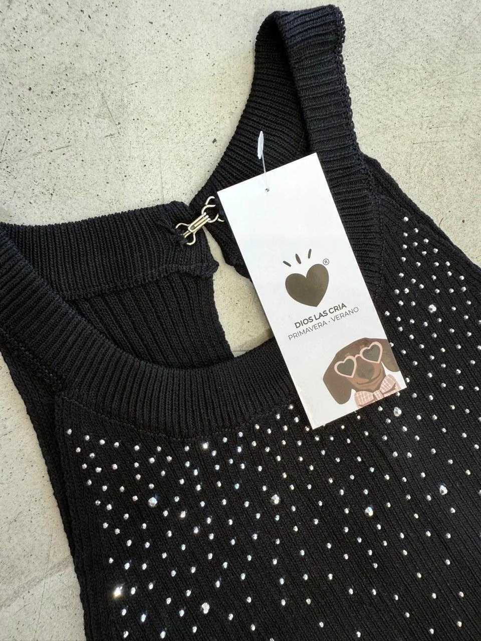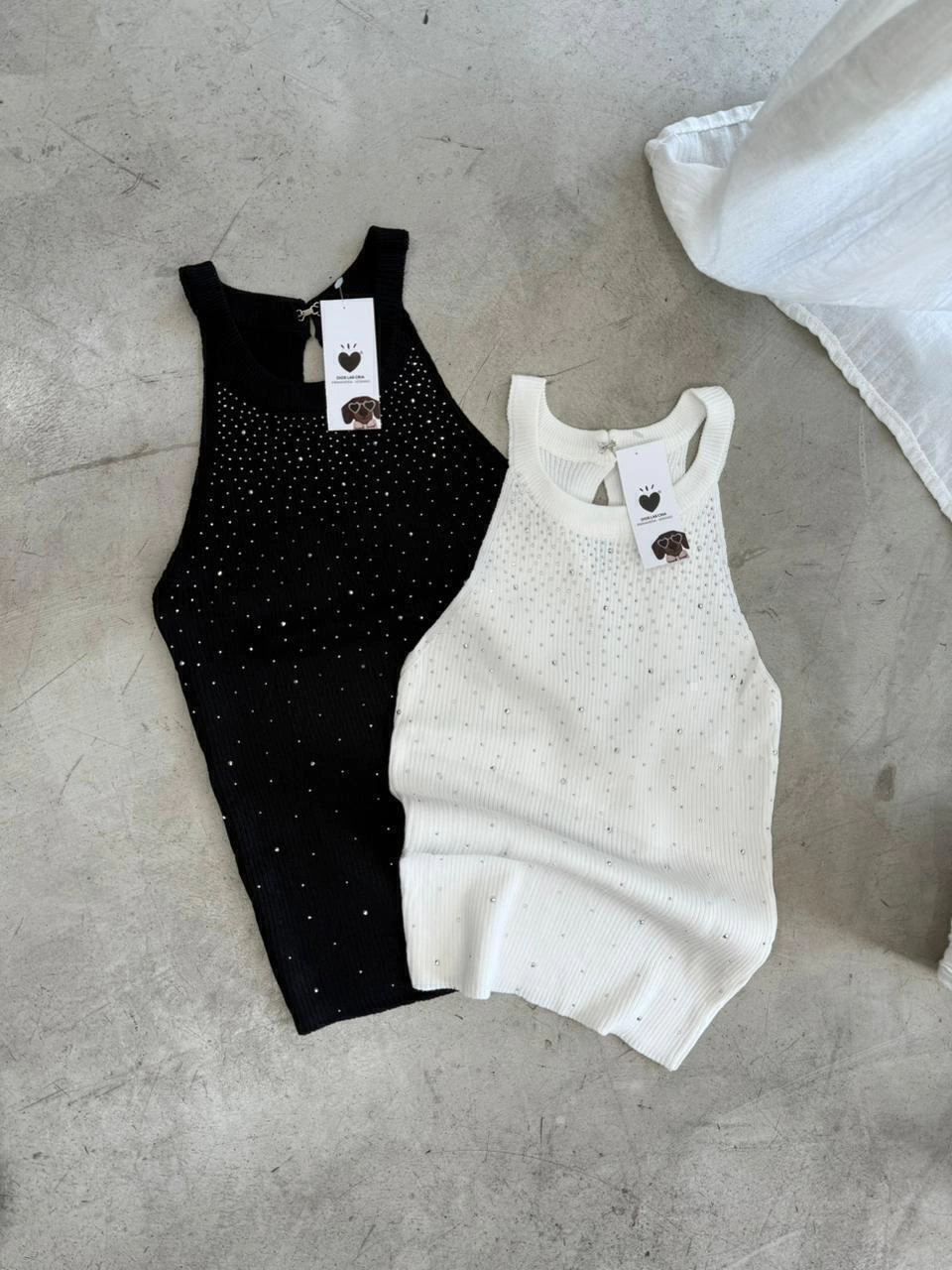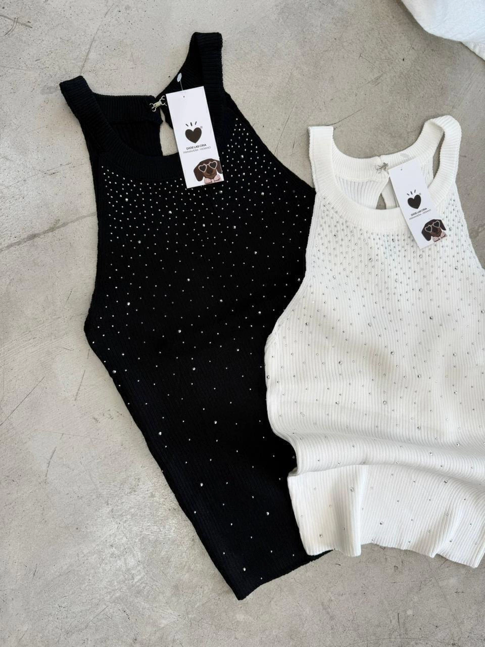 Musculosa confeccionada en hilo con lycra. Piedritas de strass y mucho spandex.