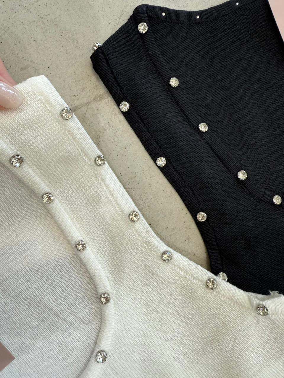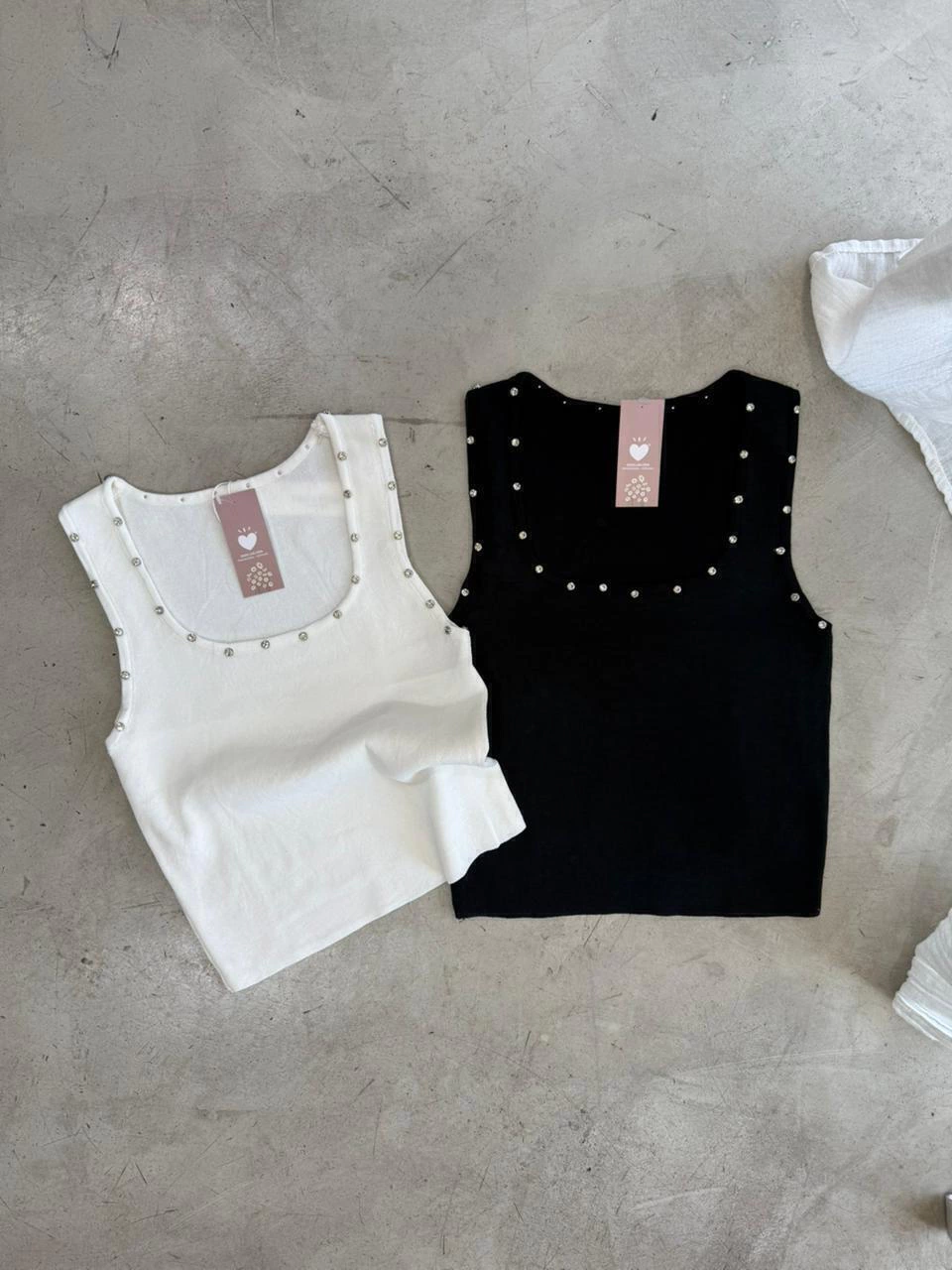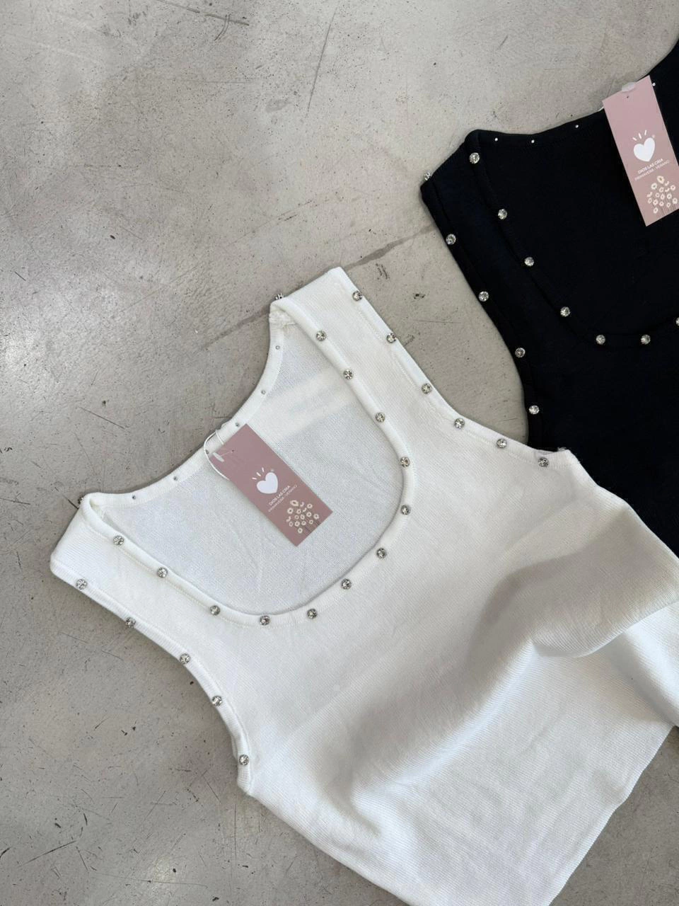 Musculosa de hilo con lycra, escote cuadrado con piedritas de strass.