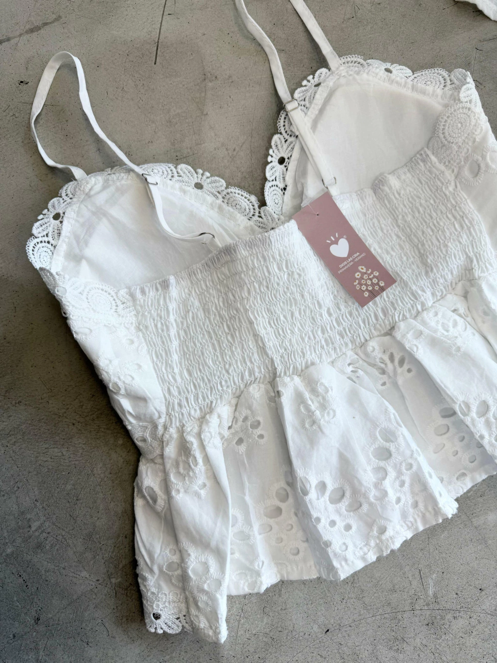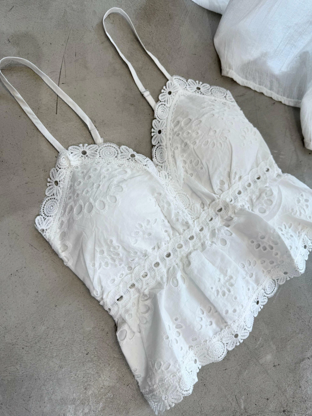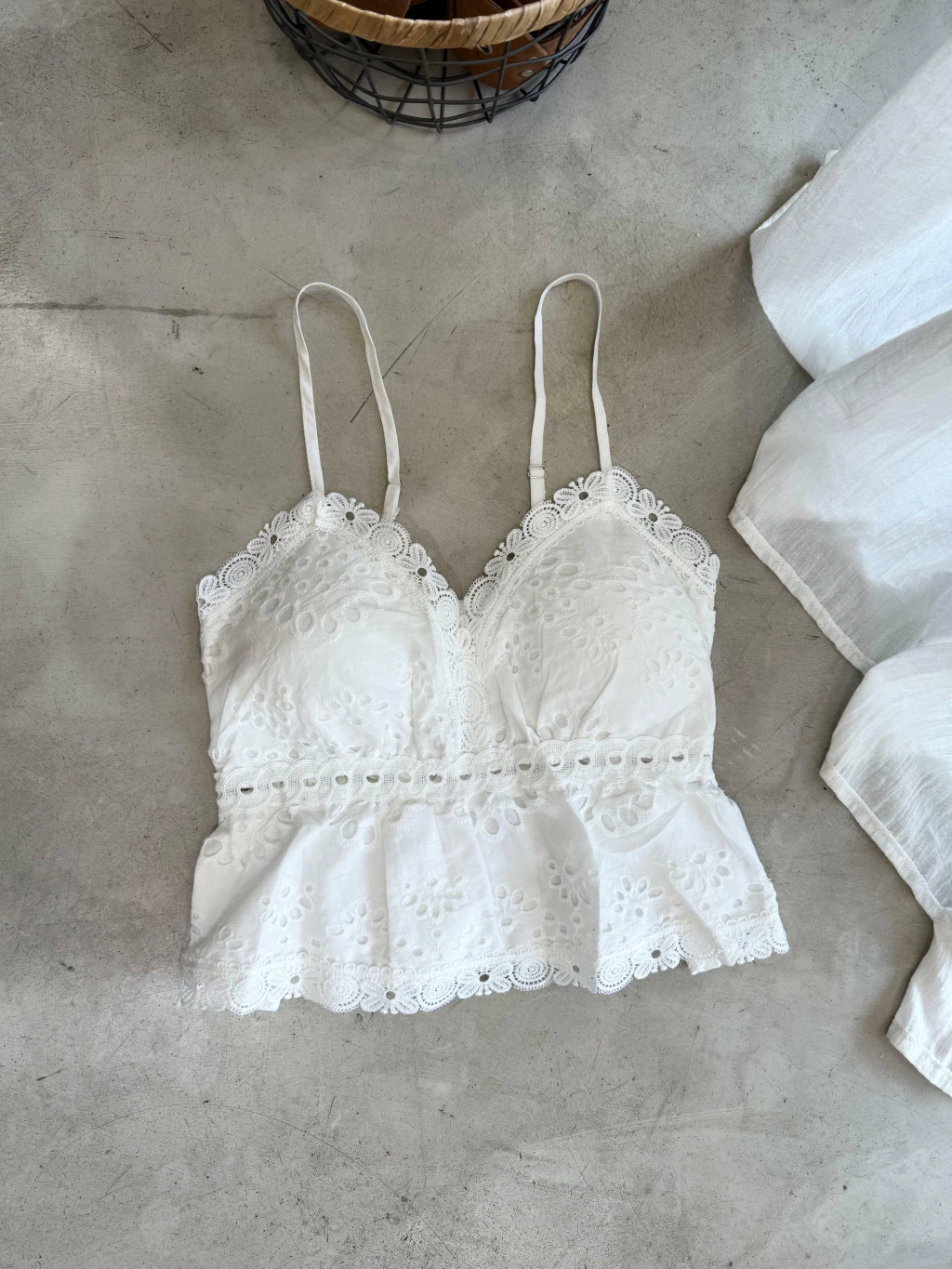 Musculosa confeccionada en broderie, con taza. Espalda multi elástico lo que permite una mejor adaptación en la espalda, bretel regulable