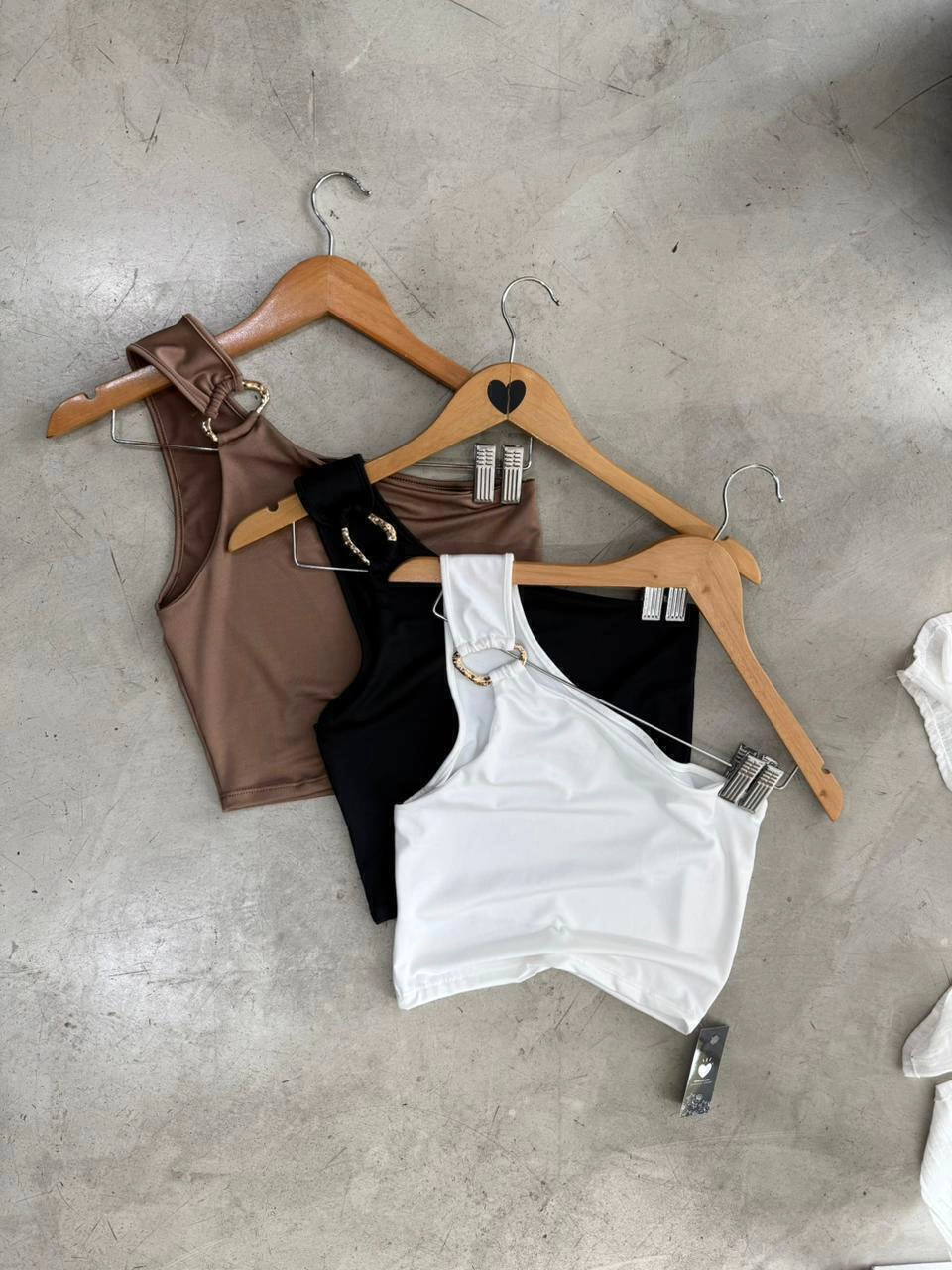 Top confeccionado en lycra de un solo bretel con aplique. Forrado en delantera