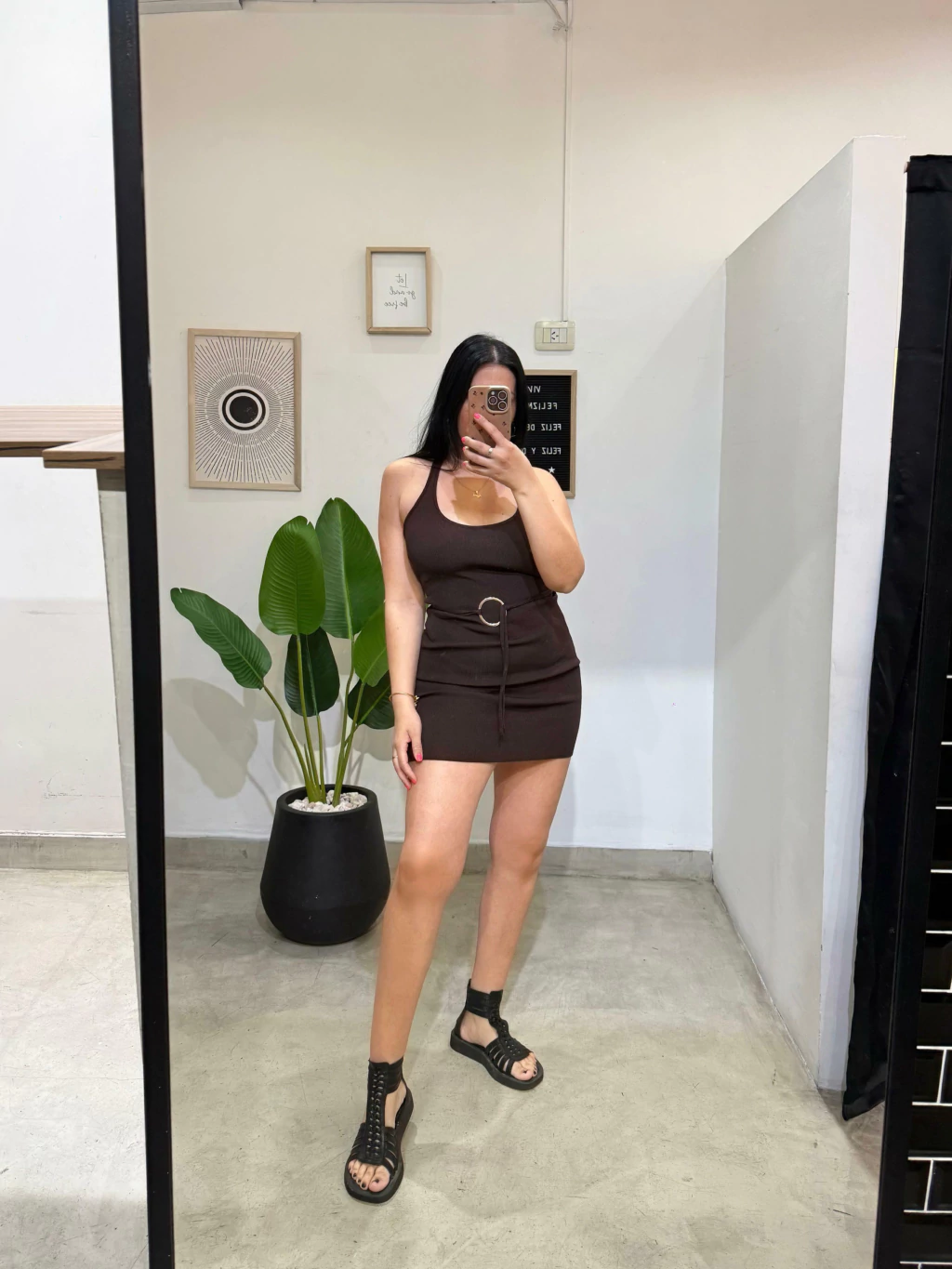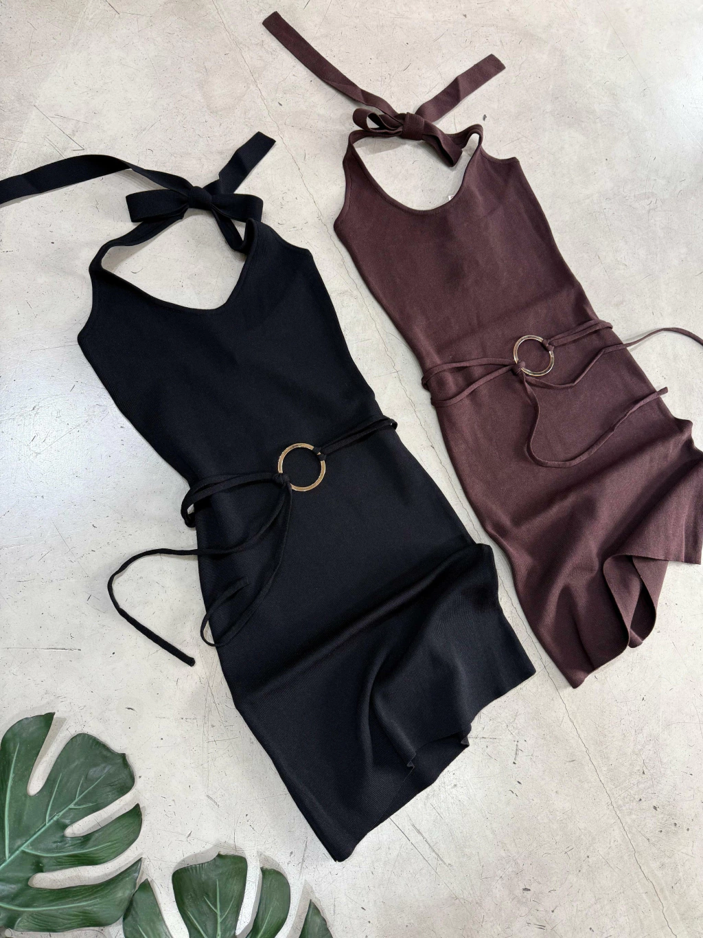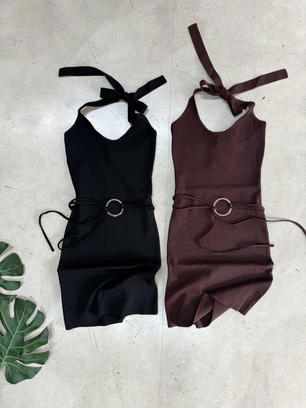 Vestido de hilo con lycra para atar en el cuello. Aplique argolla dorada. Mucho spandex
